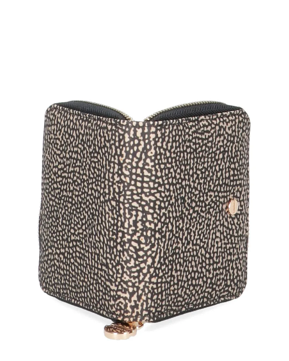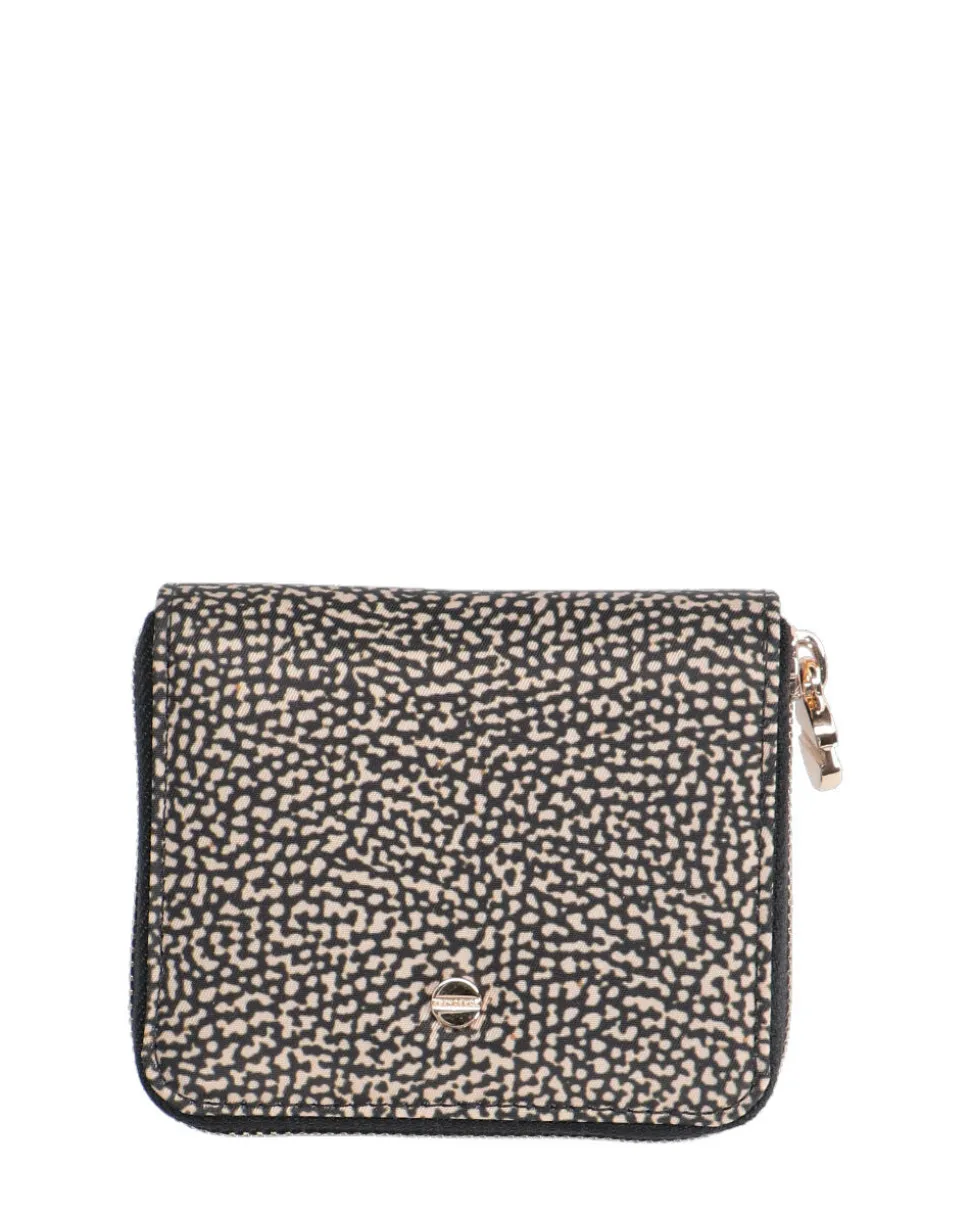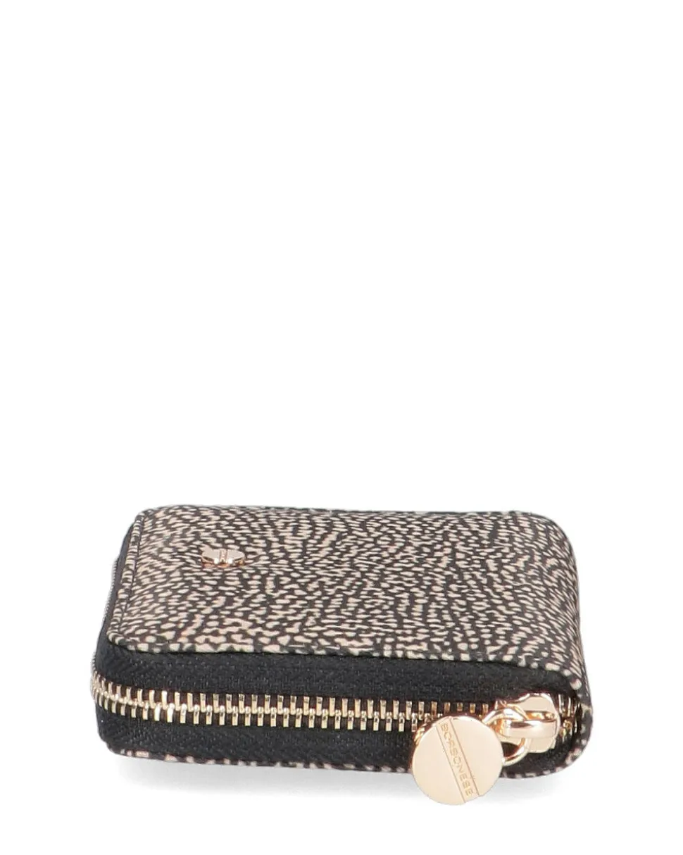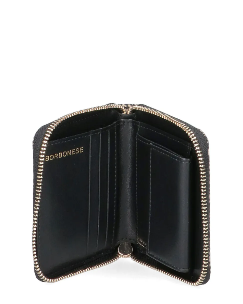 ortafoglio in fantasia iconica borbonese, interno in pelle con tasche portatessere ed una tasca con bottone a pressione, logo in metallo sul davanti, chiusura con zip