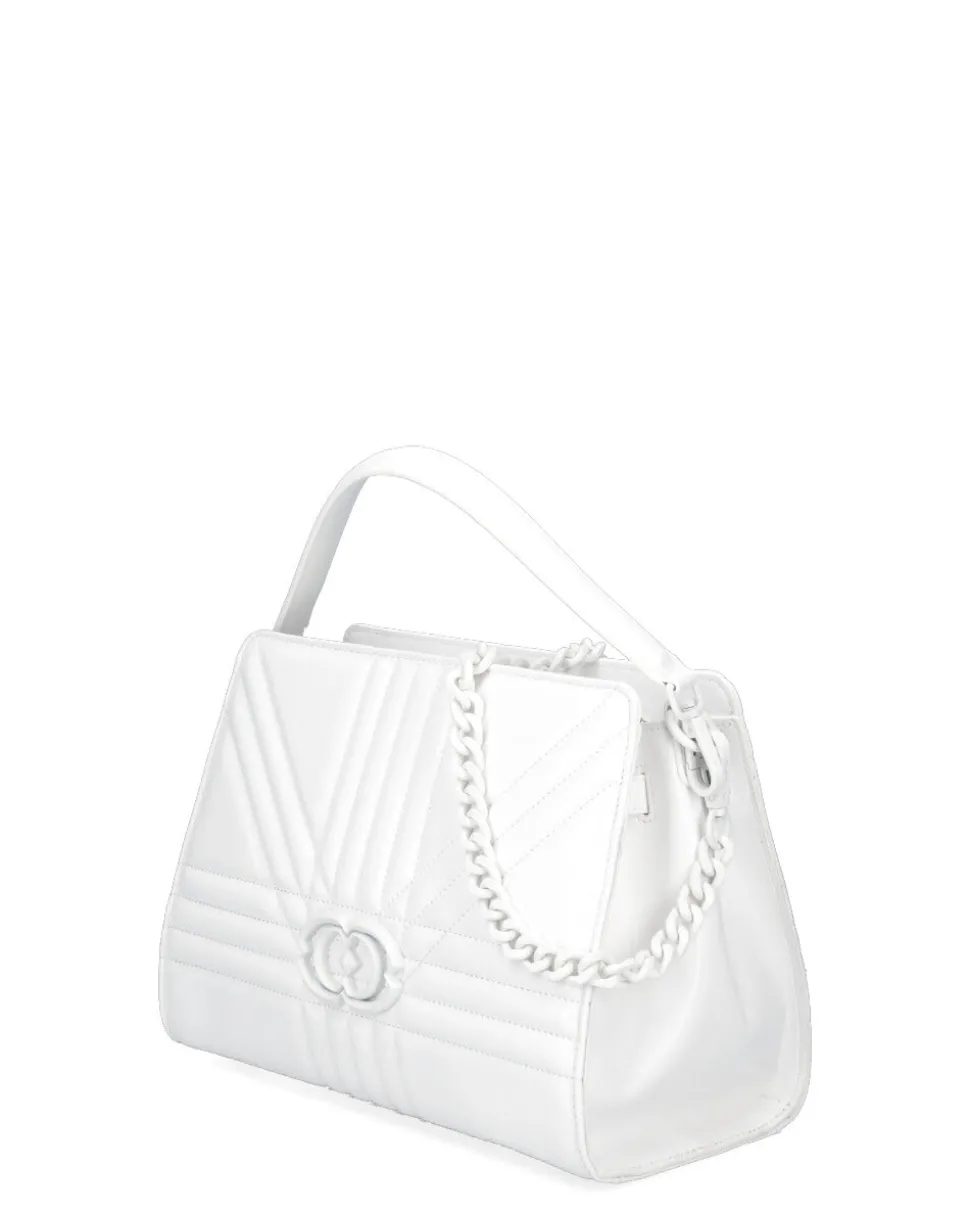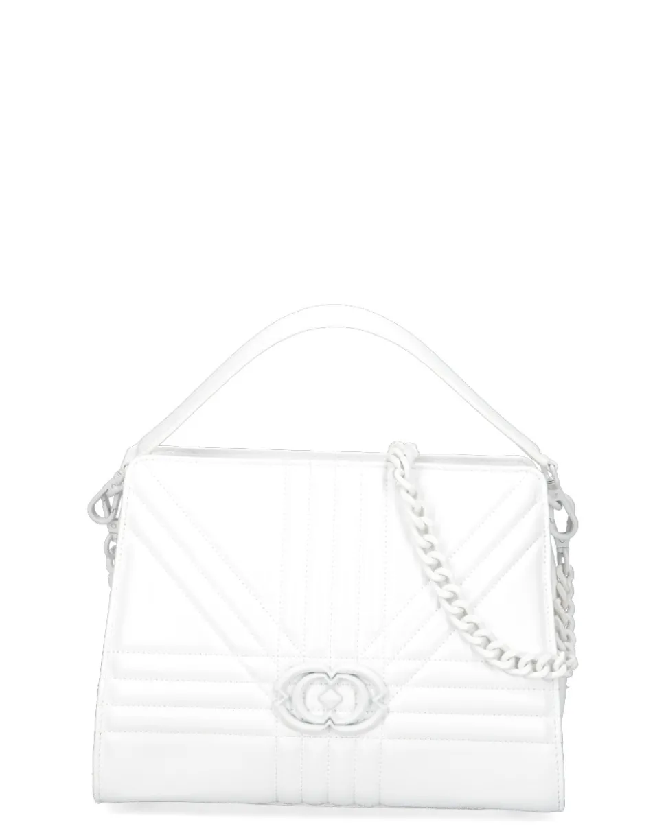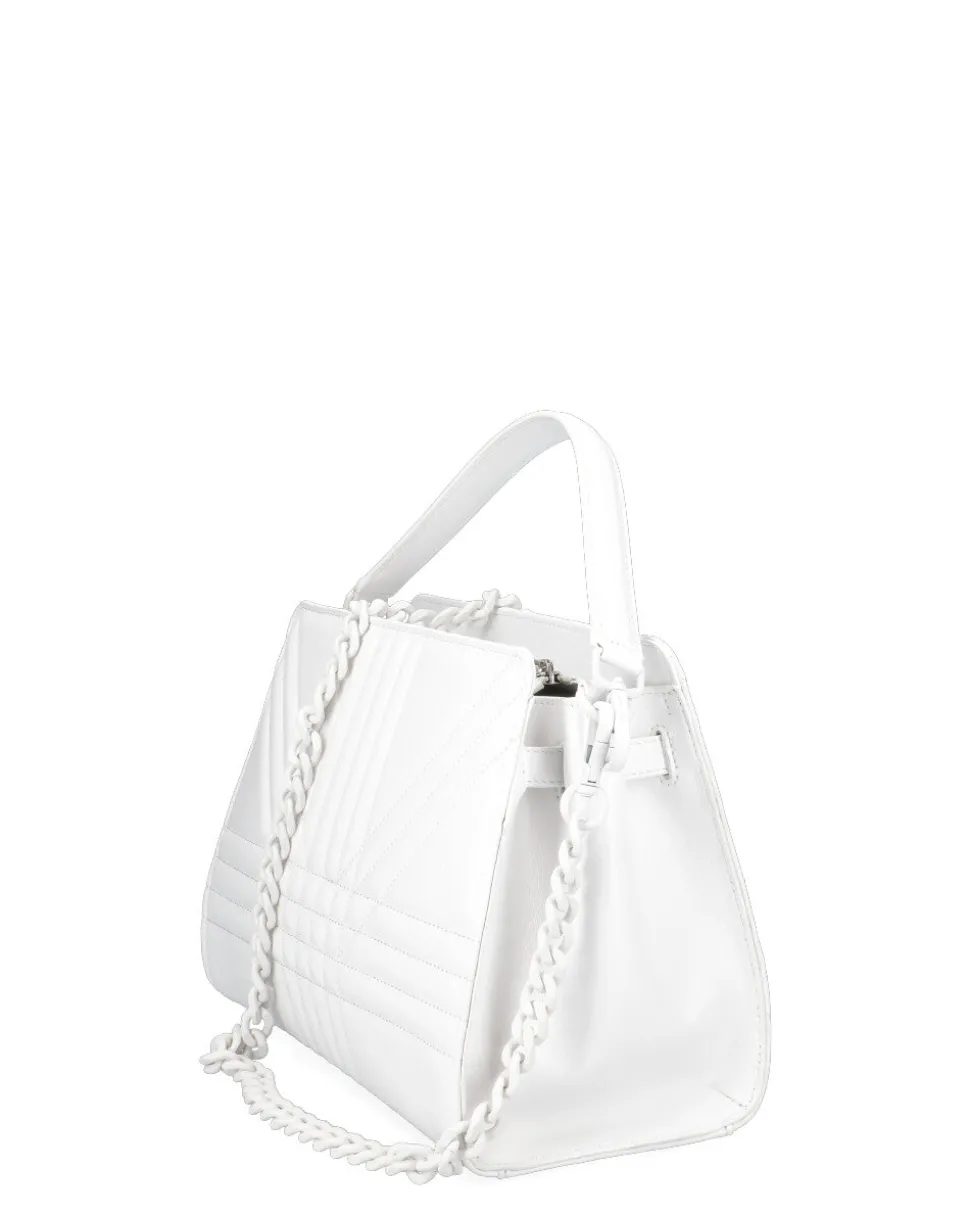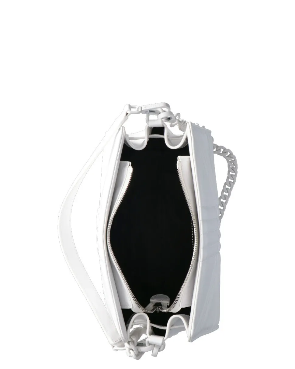 Borsa shopping in pelle nappata, imbottita e trapuntata con logo in tinta, tracolla e manico rimovibile.