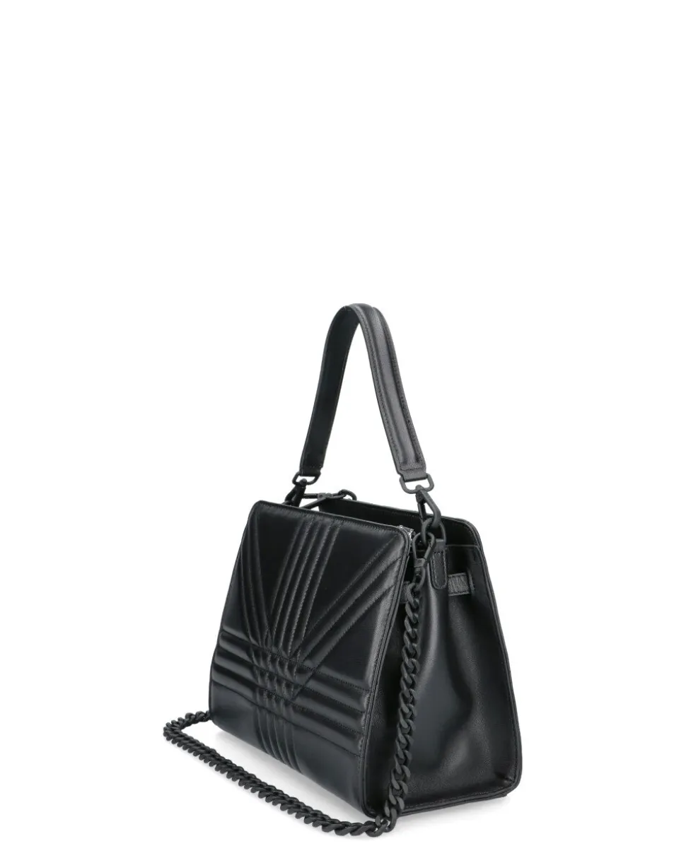 Borsa shopping in pelle nappata, imbottita e trapuntata con logo in tinta, tracolla e manico rimovibile.