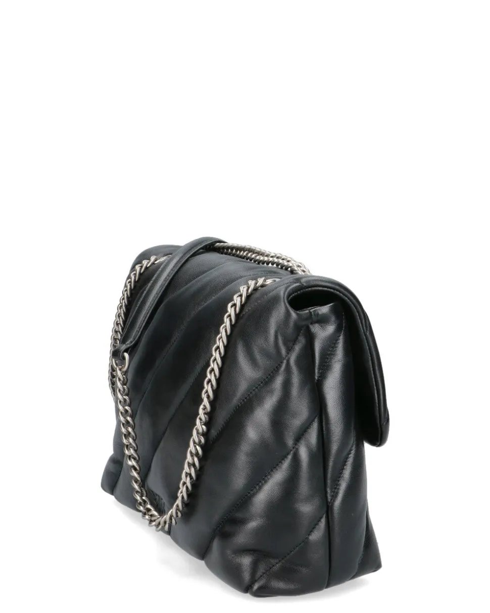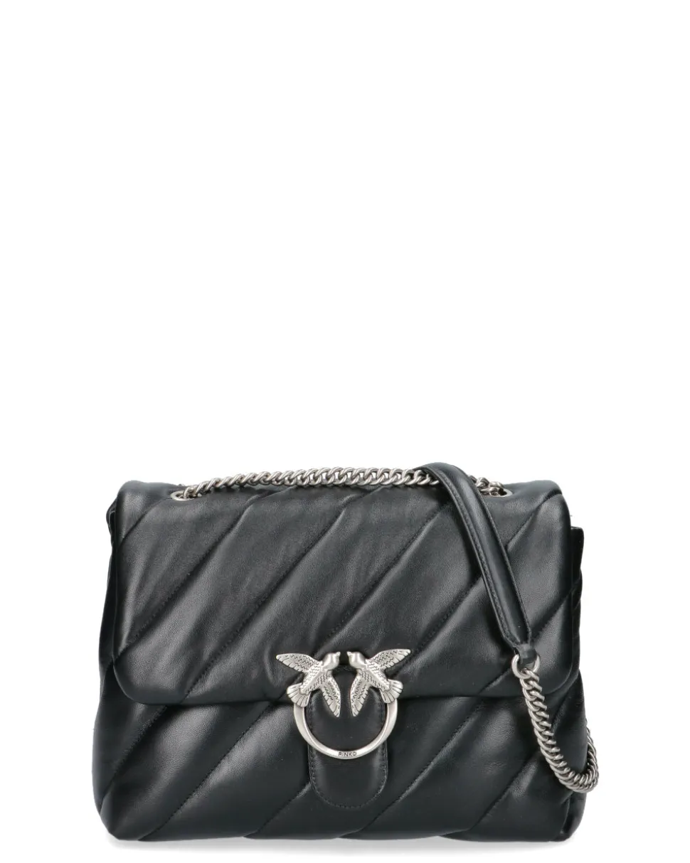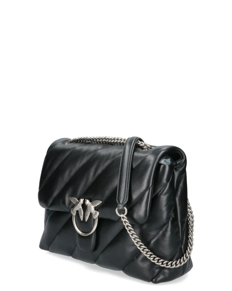 Big Love Bag Puff in morbida nappa con maxi trapuntatura obliqua. La chiusura è completata dall’iconica fibbia in metallo Love Birds Diamond Cut. L’interno è foderato in microfibra scamosciata e comprende tramezza chiusa con zip e tasca a parete. La tracolla combina la classica catena metallica rotonda al pratico spallaccio in nappa.