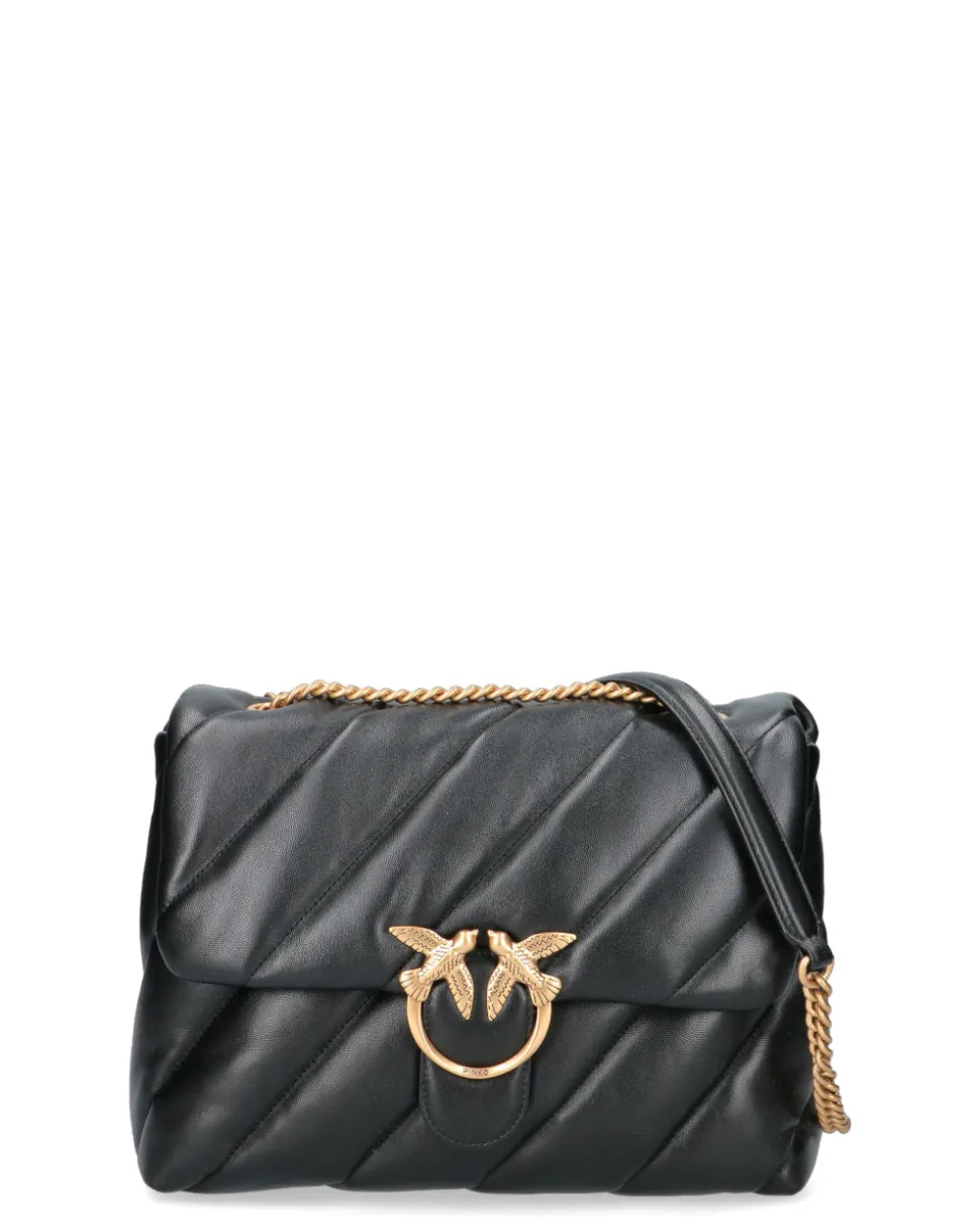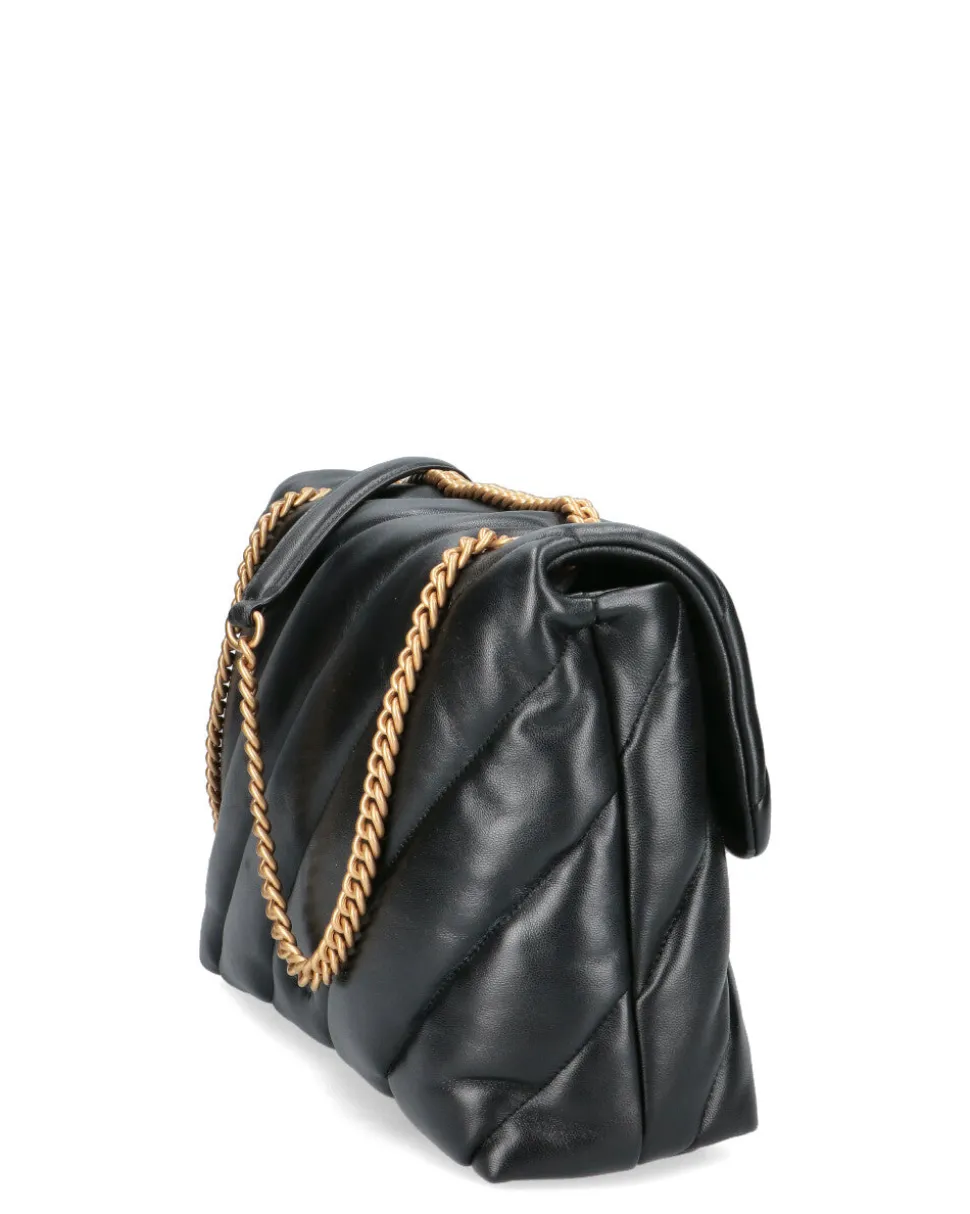 Big Love Bag Puff in morbida nappa con maxi trapuntatura obliqua. La chiusura è completata dall’iconica fibbia in metallo Love Birds Diamond Cut. L’interno è foderato in microfibra scamosciata e comprende tramezza chiusa con zip e tasca a parete. La tracolla combina la classica catena metallica rotonda al pratico spallaccio in nappa.