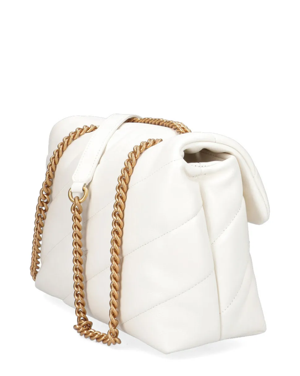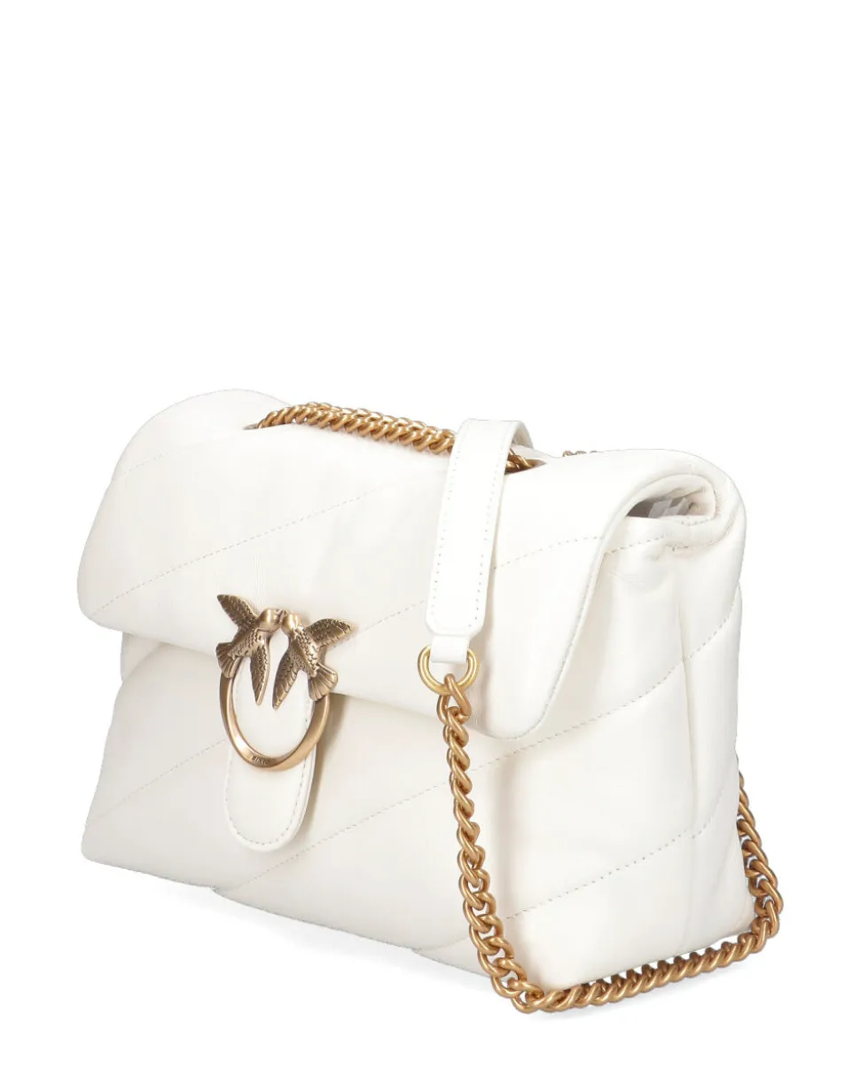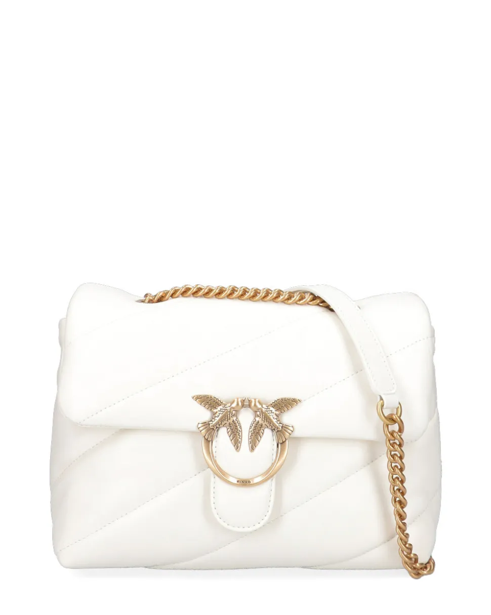 Classic Love Bag Puff in morbida nappa con maxi trapuntatura obliqua. La chiusura è completata dall’iconica fibbia in metallo Love Birds Diamond Cut. L’interno è foderato in microfibra scamosciata e comprende tramezza chiusa con zip e tasca a parete. La tracolla combina la classica catena metallica rotonda al pratico spallaccio in nappa.