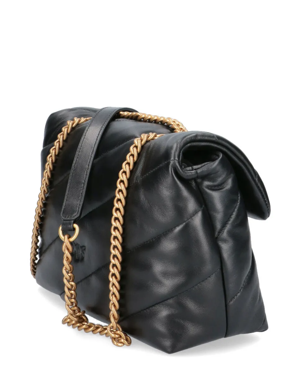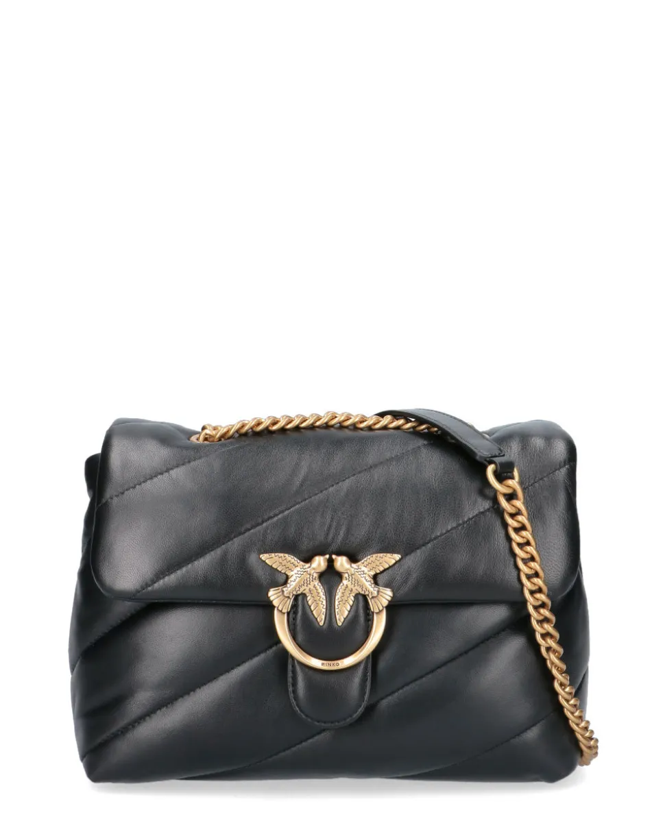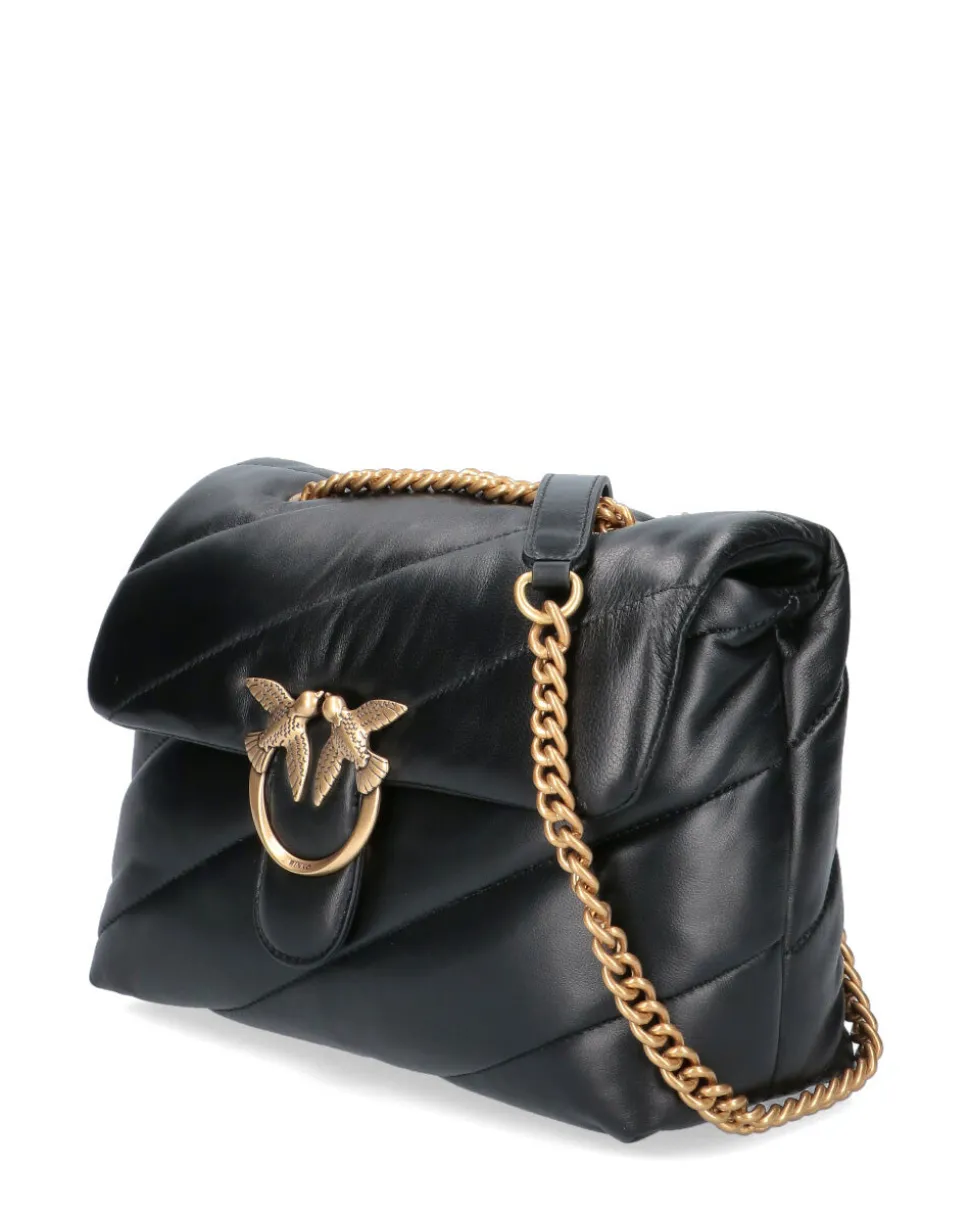 Classic Love Bag Puff in morbida nappa con maxi trapuntatura obliqua. La chiusura è completata dall’iconica fibbia in metallo Love Birds Diamond Cut. L’interno è foderato in microfibra scamosciata e comprende tramezza chiusa con zip e tasca a parete. La tracolla combina la classica catena metallica rotonda al pratico spallaccio in nappa.