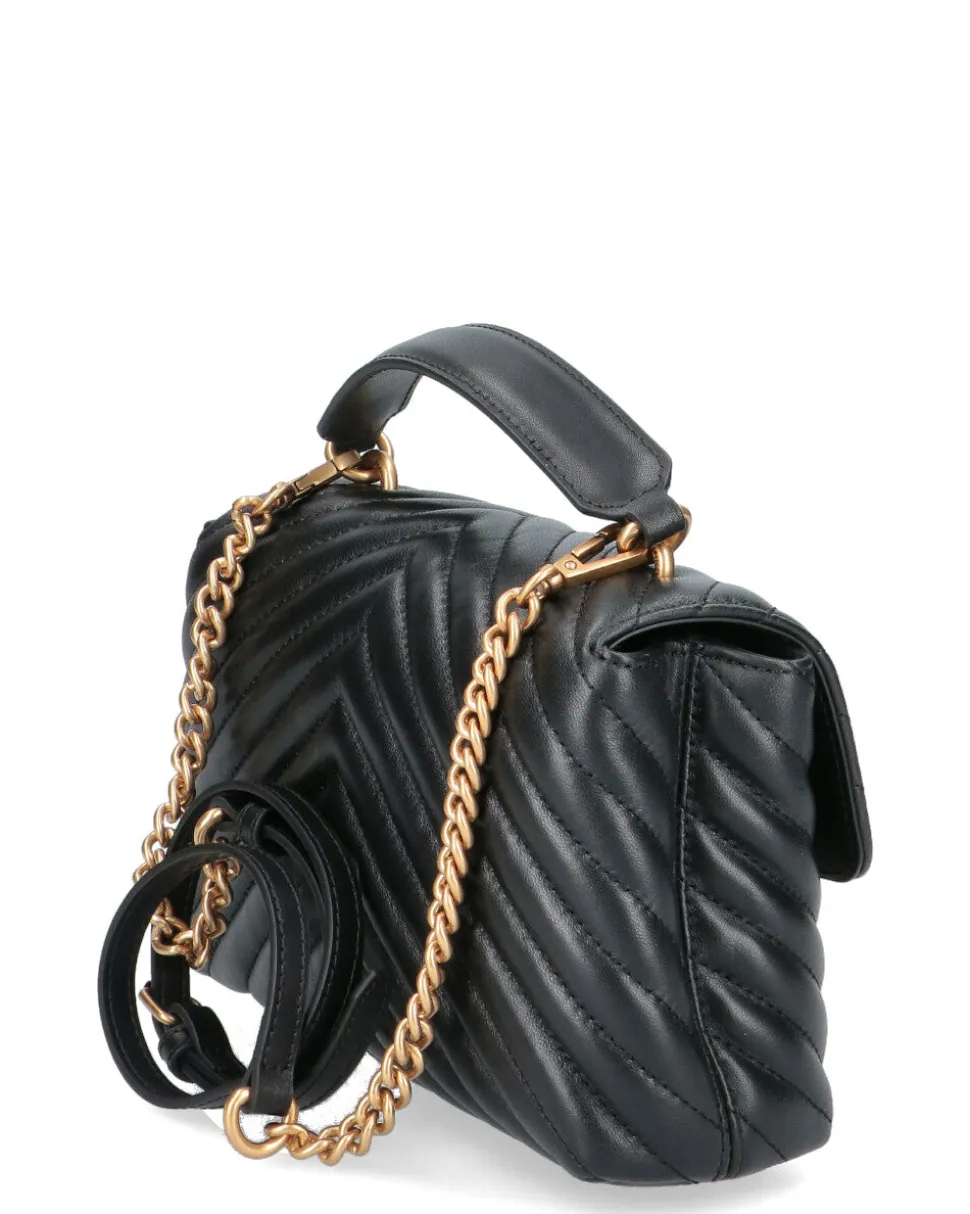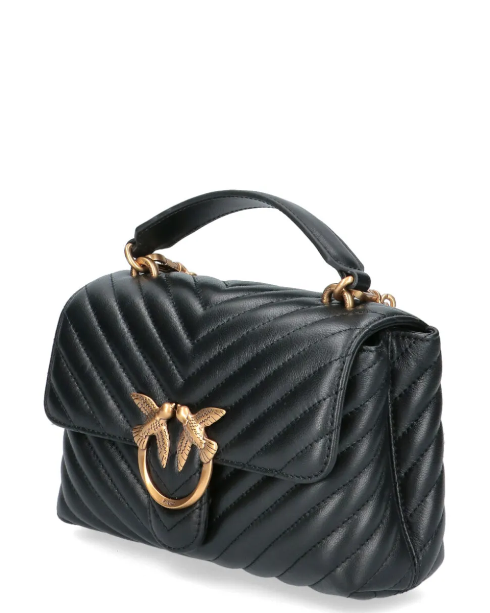 Mini Lady Love Bag Puff in nappa trapuntata con motivo chevron. La chiusura è completata dall’iconica fibbia in metallo Love Birds Diamond Cut. L’interno è foderato in microfibra scamosciata e comprende tramezza chiusa con zip e tasca a parete. Manico top handle e tracolla che combina la classica catena metallica rotonda al pratico spallaccio regolabile in nappa Misure 16*23*7 (altezza-lunghezza-larghezza)