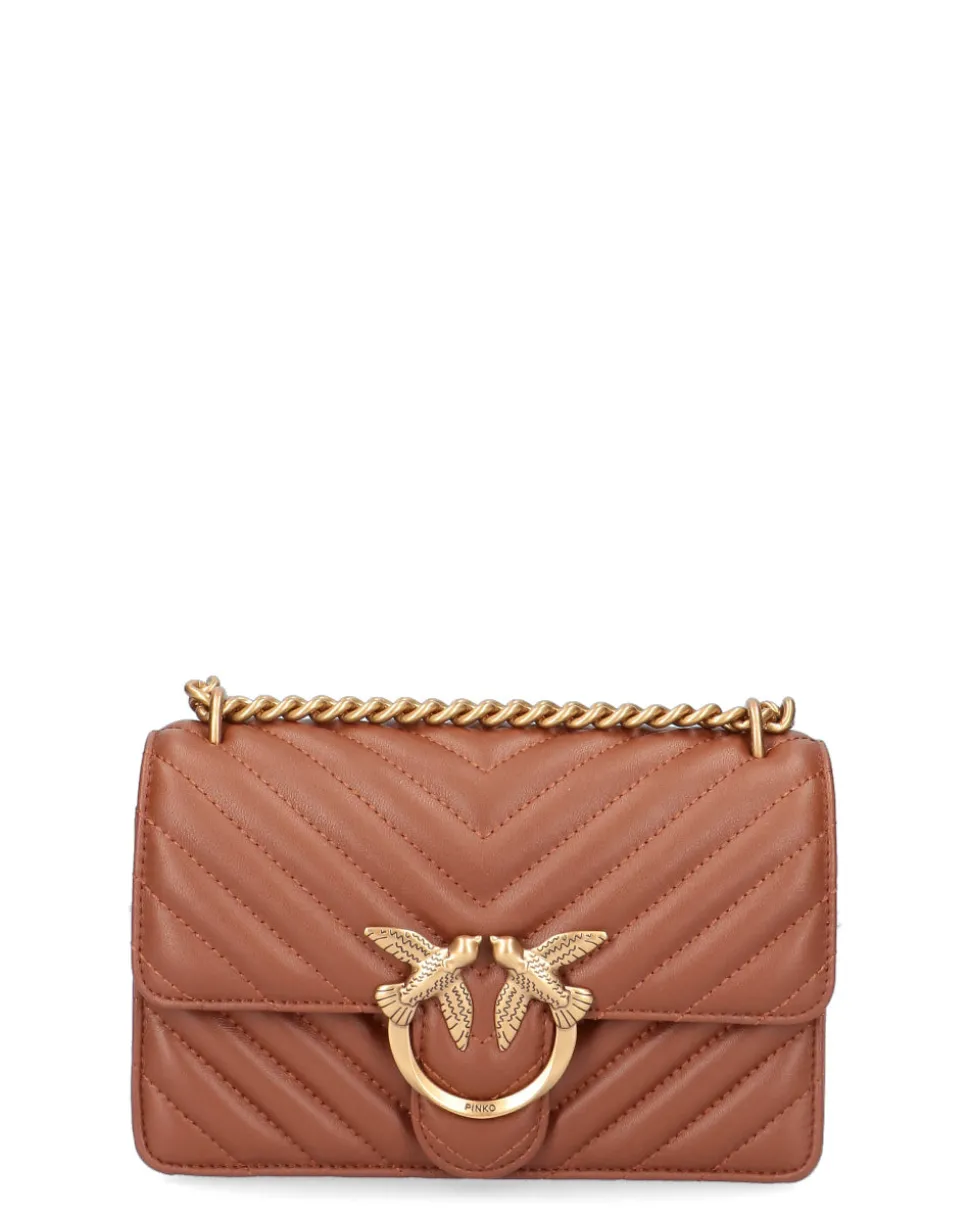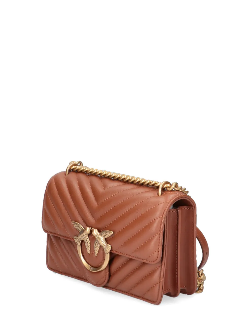 Mini Love Bag One in nappa trapuntata con motivo chevron. La chiusura è completata dall’iconica fibbia in metallo Love Birds Diamond Cut in metallo. L’interno è foderato in microfibra scamosciata e comprende tramezza chiusa con zip e tasca a parete in pelle. La tracolla combina la classica catena rotonda al pratico spallaccio in pelle regolabile.