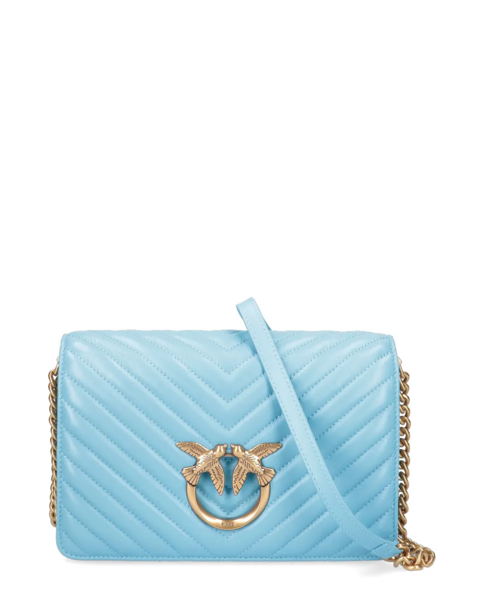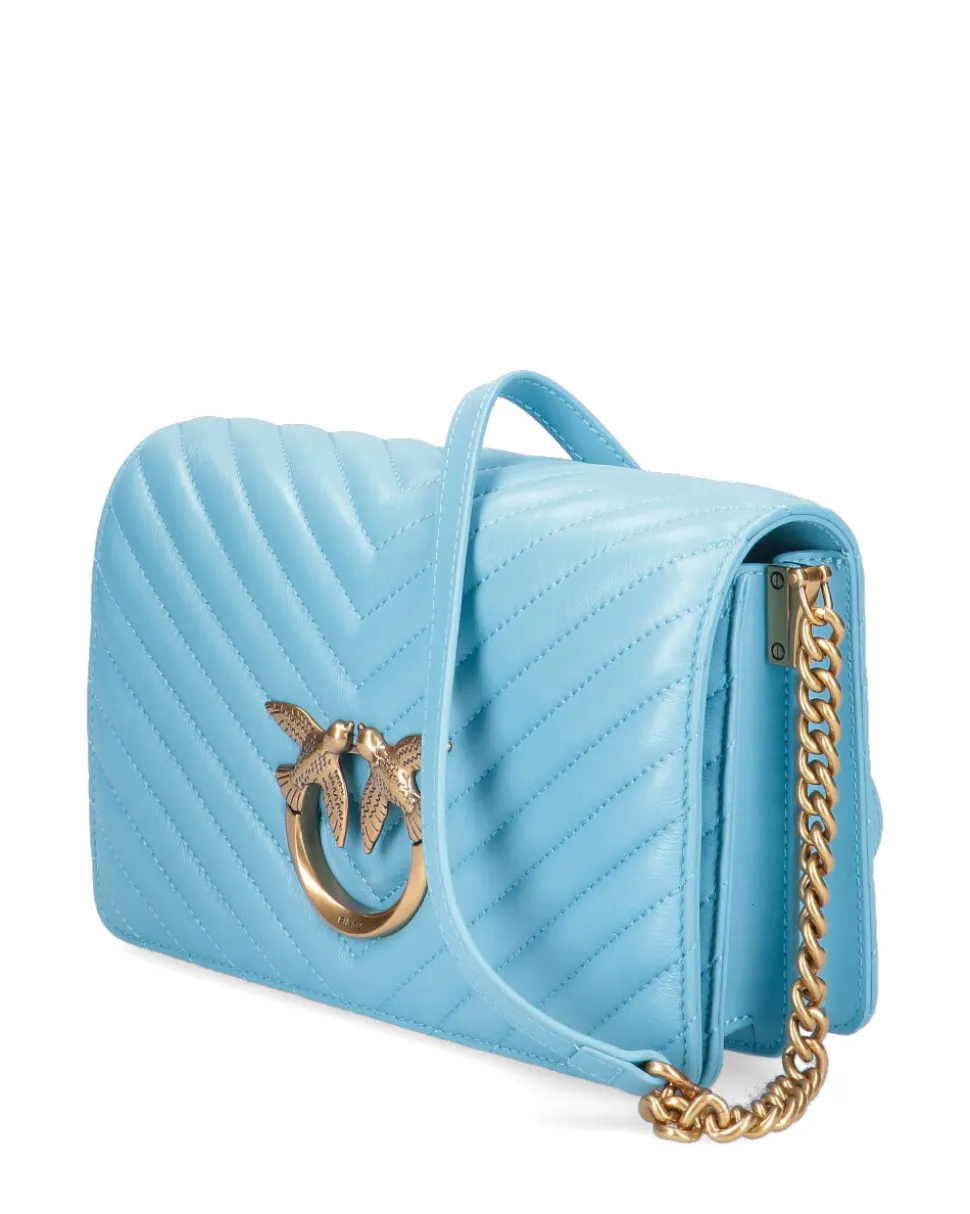 Classic Love Bag Click in nappa trapuntata con motivo chevron. La chiusura automatica nascosta è completata dall’iconica fibbia in metallo Love Birds Diamond Cut con effetto cut-out. L’interno è foderato in microfibra effetto scamosciato e comprende tramezza chiusa con zip e tasca a parete. La tracolla combina la catena metallica rotonda al pratico spallaccio in pelle regolabile.