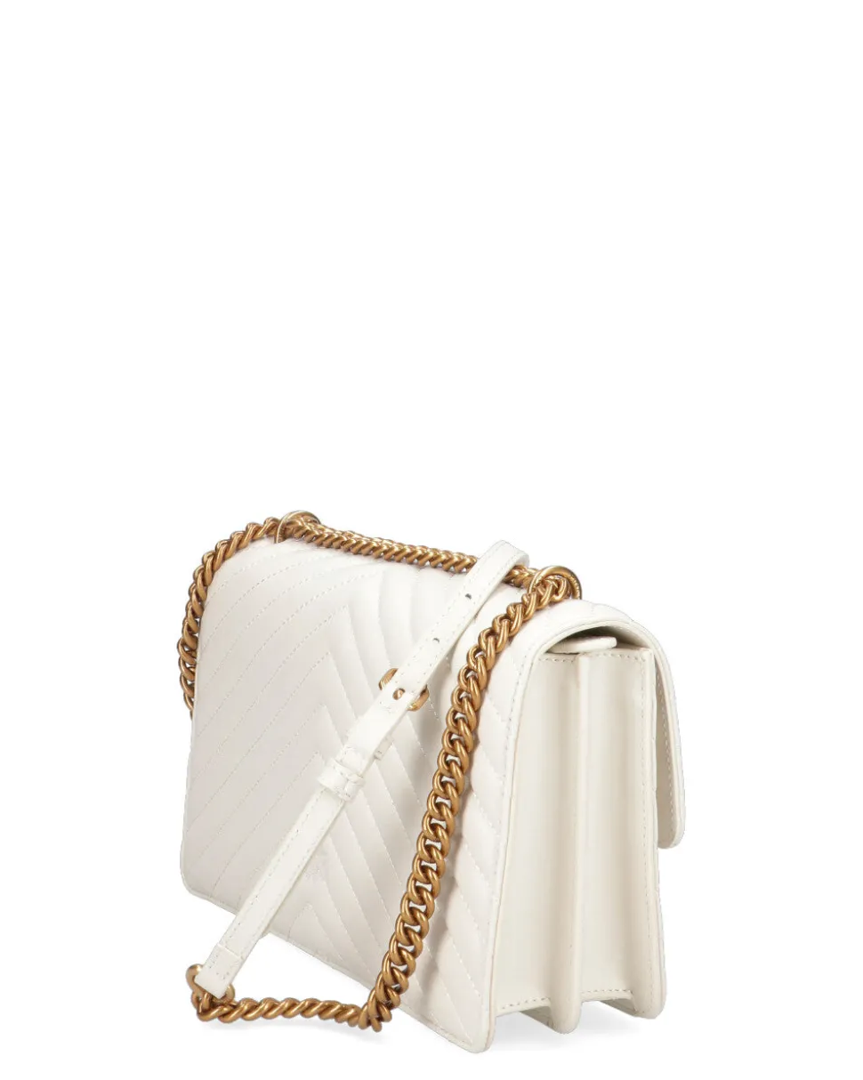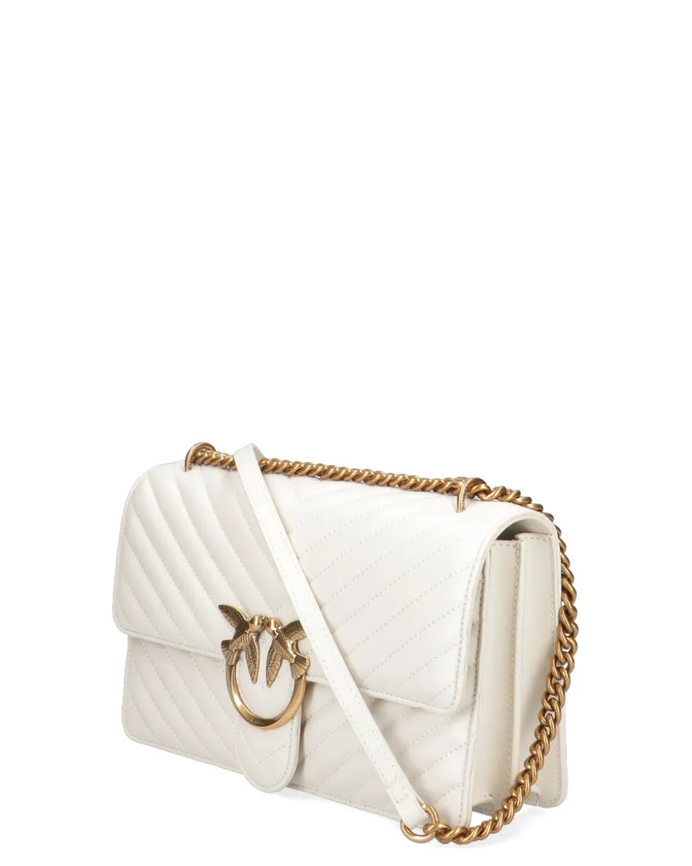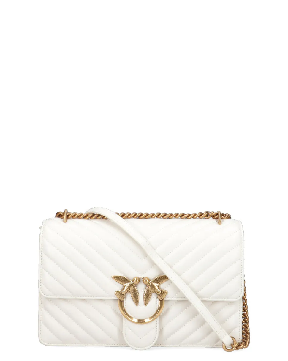 Classic Love Bag One in nappa trapuntata con motivo chevron. La chiusura è completata dall’iconica fibbia Love Birds Diamond Cut in metallo. L’interno è foderato in microfibra scamosciata e comprende tramezza chiusa con zip e tasca a parete in pelle. La tracolla combina la classica catena rotonda al pratico spallaccio in pelle regolabile.