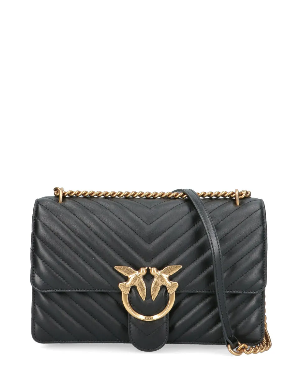 Classic Love Bag One in nappa trapuntata con motivo chevron. La chiusura è completata dall’iconica fibbia Love Birds Diamond Cut in metallo. L’interno è foderato in microfibra scamosciata e comprende tramezza chiusa con zip e tasca a parete in pelle. La tracolla combina la classica catena rotonda al pratico spallaccio in pelle regolabile.