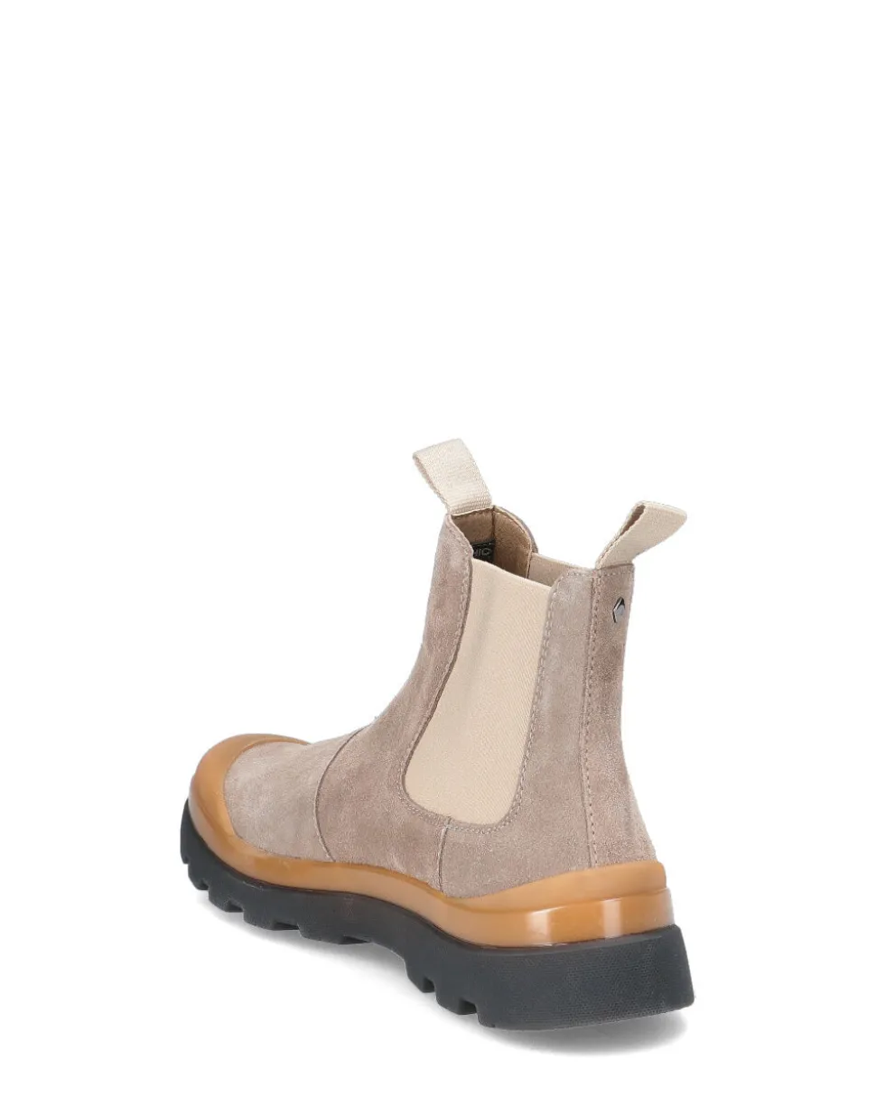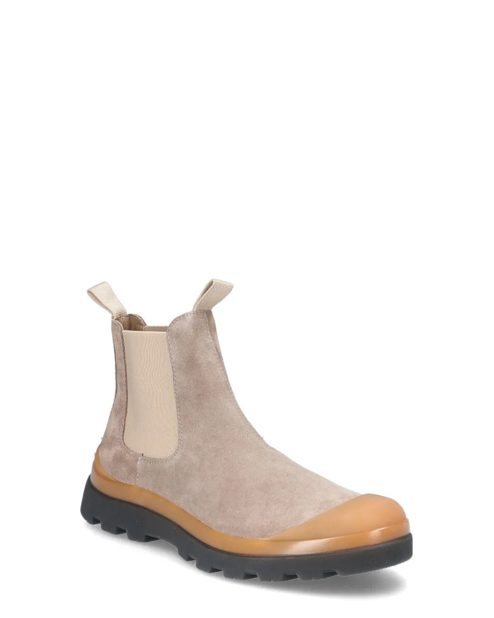 Stivaletti Beatle uomo P03 con tomaia in suede noce foderati in microfibra ed elastici laterali abbinati. Nuova suola di 2,5 cm dal design a forma di “guscio” bicolore con battistrada effetto traslucido. La linea P03 è estremamente protettiva con un gusto tecno-cool a prova di globe-trotter.
