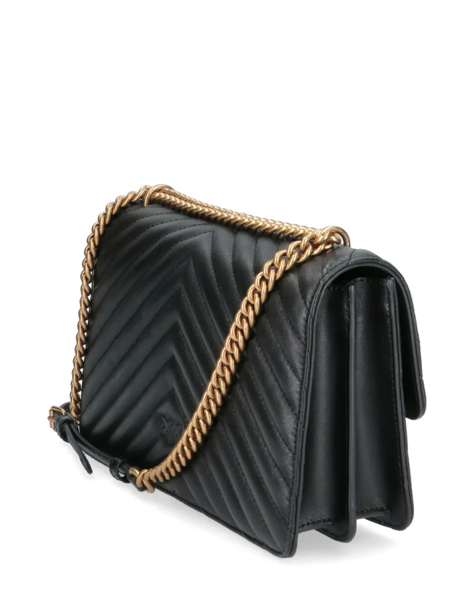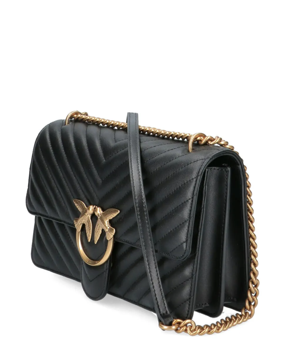 Classic Love Bag One in nappa trapuntata con motivo chevron. La chiusura è completata dall’iconica fibbia Love Birds Diamond Cut in metallo. L’interno è foderato in microfibra scamosciata e comprende tramezza chiusa con zip e tasca a parete in pelle. La tracolla combina la classica catena rotonda al pratico spallaccio in pelle regolabile.